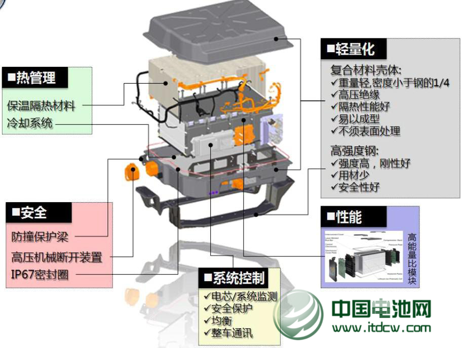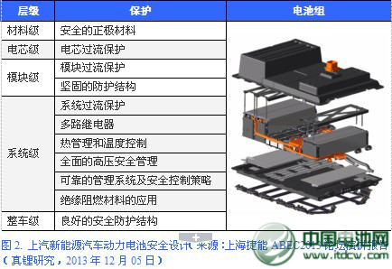 上汽稱其在車用動力電池的安全性上有完善的設(shè)計(jì)來保障,亦即在材料、電芯、模塊、系統(tǒng)和整車5個(gè)層級上多重保護(hù),層層設(shè)防,以確保電池的安全使用,見圖2。在做到5層保護(hù)的基礎(chǔ)上,電池組的位置布局也很重要。上汽的車用動力電池組布置優(yōu)先考慮整車中部,利用車結(jié)構(gòu)梁框架提供保護(hù),避免碰撞潰縮區(qū)域,這樣同時(shí)可以減少動力電池重量對整車操控性的影響。如果動力電池?zé)o法布置于整車中部區(qū)域,便要改進(jìn)整車和動力電池設(shè)計(jì)方案以確保安全。