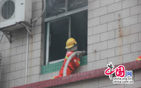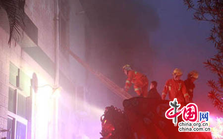 當日早上6時18分,開發區消防中隊接到報到報警后立即出動3臺消防車、24名消防官兵趕往現場。起火的廠房共三層,著火地點位于二樓,一名工人被困在三樓車間。由于廠房的窗戶都是緊閉著的,濃煙無法自然驅散,整棟廠房煙霧彌漫。消防員一邊疏散圍觀群眾,一邊敲碎窗戶玻璃,深入廠內火點進行內攻。一組消防員用兩節拉梯、掛鉤梯爬上3樓營救被困工人,另一組消防官兵佩戴空氣呼吸器進入現場搜查是否還有人員被困。經過兩個小時的緊張撲救,大火被撲滅,被困人員被成功救出。