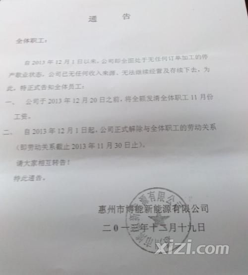 中國電池雜志-中國電池網(wǎng)12月30日訊(趙卓然 北京報(bào)道)今早接到網(wǎng)友爆料,12月19日惠州博能新能源有限公司向全體員工發(fā)布通告稱,公司自12月1日以來,已經(jīng)處于無任何訂單加工的停產(chǎn)歇業(yè)狀態(tài),公司已無任何收入來源,無法經(jīng)營及存續(xù)下去,告知全體員工:12月20日之前將全額發(fā)放11月工資;自12月1日起,公司正式解除與全體員工的勞動(dòng)關(guān)系,請大家互相轉(zhuǎn)告。