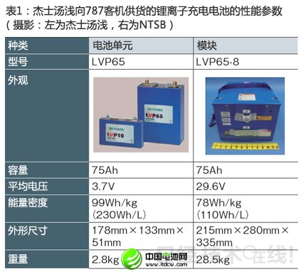 發(fā)生起火事故的電池單元是杰士湯淺專門面向787客機(jī)開發(fā)的。該公司共供貨大小兩種單元,其中串聯(lián)8個(gè)大型單元“LVP65”的模塊“LVP65-8”出現(xiàn)了異常(表1)。