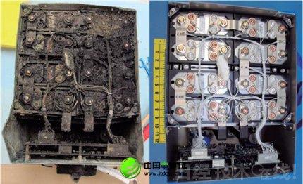 1月16日,全日本航空公司(ANA)一架從山口飛往東京的787客機(jī)因檢測(cè)到機(jī)身前部的電氣室異常冒煙,在高松機(jī)場(chǎng)緊急迫降。冒煙的原因也是因?yàn)殇囯x子充電電池模塊燒壞。這兩起事故雖然發(fā)生在不同的電氣室,但出現(xiàn)問題的則是相同型號(hào)的鋰離子充電電池模塊(圖2)。