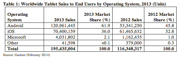 北京時間3月3日消息,據科技博客Techcrunch報道,市場研究機構Gartner今天發布的一份最新報告顯示,2013年全球平板電腦銷量達到1.95億部,其中安卓系統產品銷量為1.21億部、占比62%;蘋果iPad銷量為7000萬部、占比36%。