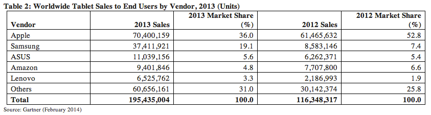 Gartner報告顯示,廠商方面,蘋果依舊一枝獨秀:去年iPad銷量達到7000萬部,份額為36%;三星憑借Galaxy系列,在平板電腦市場份額突飛猛進:去年三星平板銷量為3700萬部、占比19%。而在2012年時,蘋果在平板電腦市場份額高達53%,而三星份額僅為7%。華碩平板去年銷量為1100萬部,市場份額為5.6%,列第三。