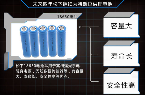 其實,早在2011年松下就已于特斯拉展開合作,兩年來已為其提供2億個鋰離子電池單元,特斯拉Model S使用的就是松下18650電池,此次繼續合作可謂“水到渠成”。特斯拉對供應商的的選擇一直較為嚴格。網通社查閱相關資料后了解到:松下18650電池常用于高檔強光手電、隨身電源,無線數據傳輸器等,有容量大、壽命長、安全性高等優點。