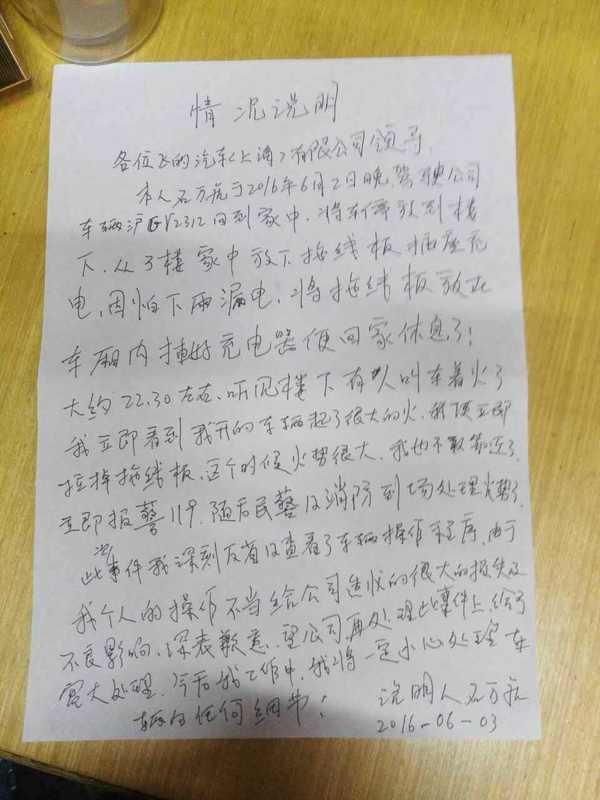 就在事件發生不久后,當事人石先生承認了事故是由于自己充電操作不當而導致火災。于是石先生手寫了一張情況說明。
