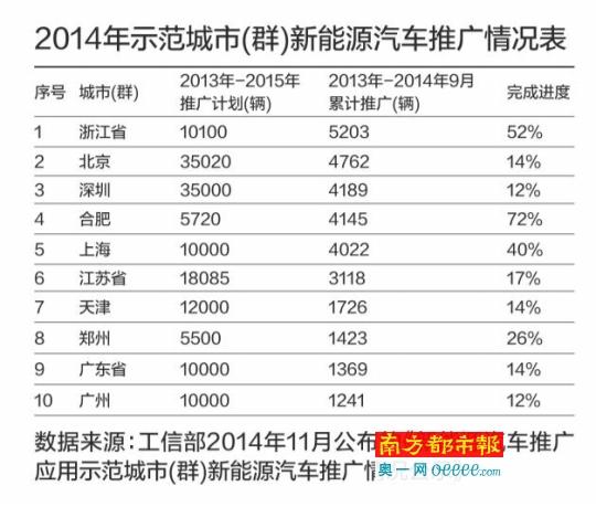 2014年11月,工信部曾公布了新能源汽車推廣應用城市(群)的新能源汽車推廣情況和配套政策出臺情況,據統計,從2013年1月至2014年9月底,39個推廣應用城市(群)88個城市累計推廣新能源汽車3.86萬輛,而按計劃,2013年至2015年,這39個推廣應用城市(群)88個城市應累計推廣新能源汽車33.6萬輛。一年半時間過去,推廣進度只是原來的十分之一,不免讓人擔憂。而在這些城市(群)中,浙江省是推廣量最多的示范點,其間共推廣5203輛,但完成進度也只是原來計劃的52%,按計劃,其2013年-2015年推廣量是10100輛。