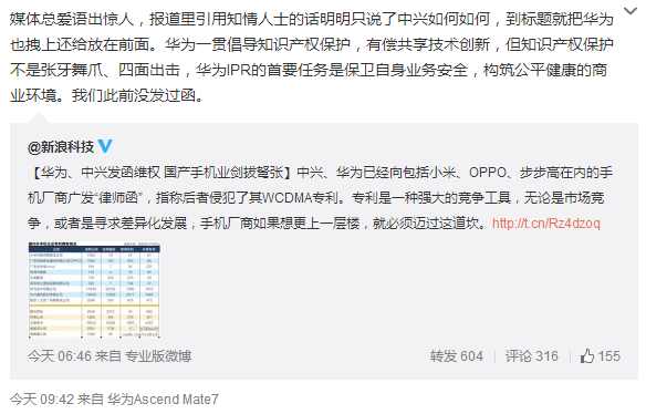 今天上午,華為知識產權部部長丁建新在微博上表示,“媒體總愛語出驚人,報道里引用知情人士的話明明只說了中興如何如何,到標題就把華為也拽上還給放在前面?!彼f,“華為一罐倡導只是產權保護,有償共享技術創新,但只是產權保護不是張揚舞爪、四面出擊,華為IPR的首要任務是保衛自身業務安全,構筑公平健康的商業環境。我們此前沒發過函?!?/p>