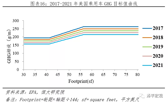 1)CAFE和GHG標準:2010年5月,奧巴馬要求美國環保署(EPA)和美國公路安全管理局(NHTSA)根據《Clean Air Act》和《Energy Independence and Security Act of 2007》推行國家級2017-2025年輕型車項目,以提升CAFE和降低GHG排放。其中,EPA負責制定2017-2025年GHG標準,NHTSA負責制定2017-2025年CAFE標準。GHG政策第一階段“2017-2021”標準已頒布,第二階段“2022-2025”標準,因2018年4月2號,特朗普政府指責過于嚴苛,影響就業,需重新修改,新版本暫未公布。CAFE政策第一階段“2017-2021”標準已頒布,第二階段“2022-2025”標準中期評估中,暫未公布。CAFE與GHG相似處頗多:1)皆采用積分制,GHG排放低于目標值可獲得正積分,反之負積分;2)其標準值皆是分車型、參考汽車占地面積“Footprint”為參考。以GHG標準為例,其2017-2021年乘用車目標值曲線如下,對于不滿足GHG標準的車企,根據《Clean Air Act》第205條款,最高可單車罰款37500美元。