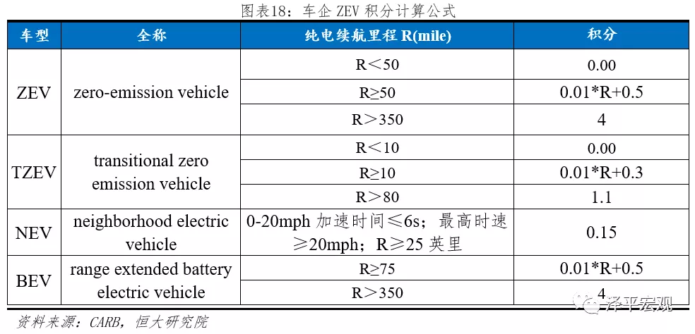 (2)ZEV積分公式:CARB根據下表所示積分公式計算各企業ZEV積分,并進行年度公示。根據《Health and Safety Codesection 43211 civil penalty》條例,對于不滿足ZEV積分要求的公司,每個ZEV積分罰款5000美元。