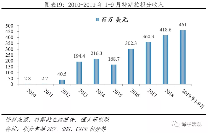 據特斯拉披露,2010-2019Q3特斯拉累計積分銷售收入21.68億美元,其中2016、2017、2018年,ZEV和非ZEV積分收入分別為2.15、0.87,2.80、0.81,1.03、3.15億美元。