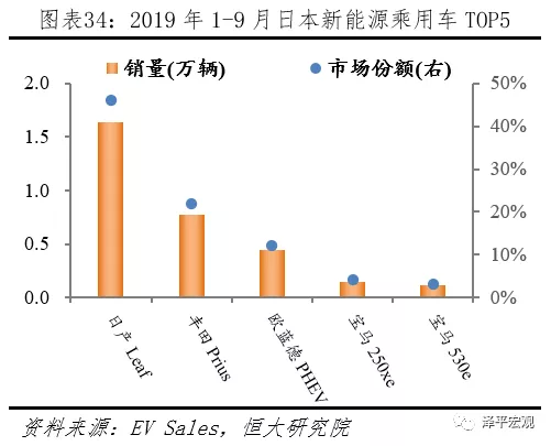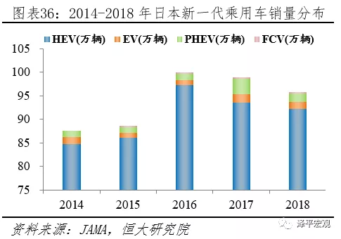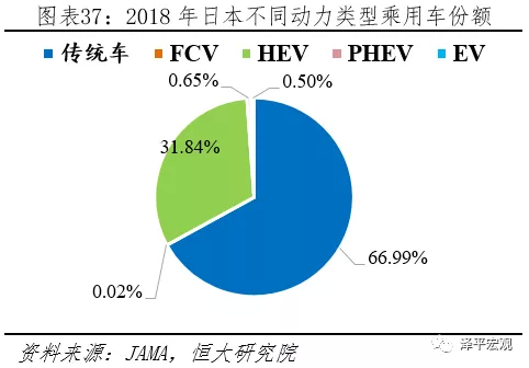 日本新一代汽車HEV占據統治地位。日本由于發動機技術領先,發展HEV有天然優勢,故將HEV納入新一代汽車體系,與EV和PHEV共同發展。據日本汽車銷售聯合會(JAMA)披露,2018年日本乘用車新車HEV、EV、PHEV、FCV、傳統車銷量分別為92.18、1.46、1.88、0.06、193.97萬輛,分別占比66.99%、31.84%、0.65%、0.50%、0.02%。