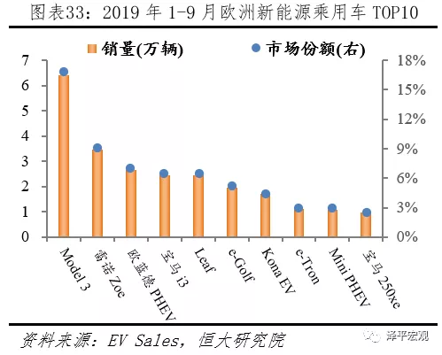 TOP20車型中國占有9席、歐盟占據5席、特斯拉全系上榜、Model 3一枝獨秀。據EV Sales統計,2019年1-9月全球新能源乘用車TOP20車型銷量從高到低依次為:Model 3、EU系列、元/S2 EV、Leaf、歐藍德 PHEV、寶駿 E系列、530e/Le、Zoe、Kona EV、寶馬i3、唐 PHEV、eQ EV、PriusPHEV、Model X、比亞迪e5、帝豪 EV、e-Golf、榮威 Ei5 EV、歐拉 R1 EV、Model S;對應銷量20.80、7.43、6.08、5.38、3.86、3.73、3.68、3.52、3.30、3.06、3.00、2.96、2.87、2.86、2.84、2.73、2.54、2.35、2.26、2.05萬輛;其中中國9款,美國3款,日本2款,歐盟5款,韓國1款。