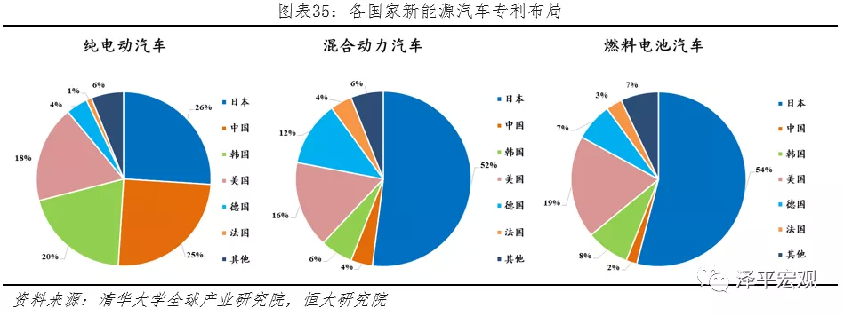 專利是技術實力的象征,也是企業前瞻性布局的體現。2019年10月,清華大學全球產業研究院發布《新能源汽車全球專利觀察》報告指出,到2019年7月全球各國,在BEV車型方向專利件數占比分別為:日本26%、中國25%、韓國20%、美國18%、德國4%、法國1%;HEV車型方向專利件數占比分別為:日本52%、中國4%、韓國6%、美國16%、德國12%、法國4%;FCV車型方向:日本54%、中國2%、韓國8%、美國19%、德國7%、法國3%。