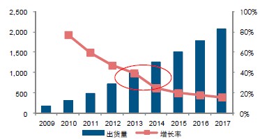 圖2:2009-2017全球智能手機(jī)出貨量(百萬(wàn)臺(tái))