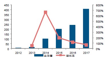 圖7:2012-2017全球可穿戴設(shè)備出貨量(百萬(wàn)臺(tái))