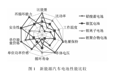 蓄電池在純電動(dòng)汽車中是驅(qū)動(dòng)系統(tǒng)唯一動(dòng)力源,主要有鎳鍋、鎳氫和鋰離子電池等。目前,鏗離子電池處于高速發(fā)展階段,在諸如日產(chǎn)Leaf、豐田普銳斯plug-in、特斯拉Model S、通用Volt、福特Focus EV以及寶馬i3等新能源汽車上都采用鋰離子電池。此外,鏗資源較為豐富,價(jià)格也不貴,可以說(shuō)鋰離子電池是蓄電池中目前最被市場(chǎng)看好的動(dòng)力電池。4類蓄電池的性能比較見(jiàn)圖1。