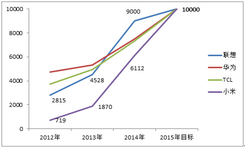 2015年是個(gè)關(guān)鍵節(jié)點(diǎn),這一年將有幾家國產(chǎn)手機(jī)廠商的年銷量超過1億部。曾對(duì)外表態(tài)2015年目標(biāo)是超1億部的廠商有5家。中興三年前年銷量已經(jīng)近7000萬部,三年目標(biāo)中提過,但歷經(jīng)虧損轉(zhuǎn)型,目前看不現(xiàn)實(shí)。而且中興終端事業(yè)部CEO曾學(xué)忠曾明確表示,2015年中興智能手機(jī)銷量目標(biāo)是6000萬部,按當(dāng)前手機(jī)市場智能機(jī)占比90%倒推,2015年中興全部手機(jī)銷量目標(biāo)在6600-7000萬部。剩下的四家分別是聯(lián)想、華為、TCL、小米,我們來逐一分析一下。