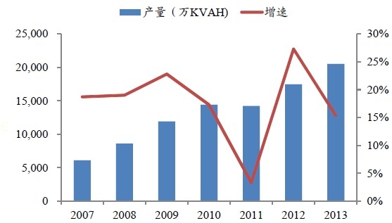 盡管近年來鋰離子電池成為熱點,但是鉛酸電池作為技術成熟的化學電源,憑借其安全性高、價格低廉等優勢在絕大多數傳統領域和部分新興應用領域占據著牢固的地位;根據國家統計局的數據,2013年我國鉛酸蓄電池產量達到2.05億千伏安時,同比增長15.4%,從2007年到2013年間,除了2011年行業整治造成產量增速下滑以外,行業復合增速達到22%。