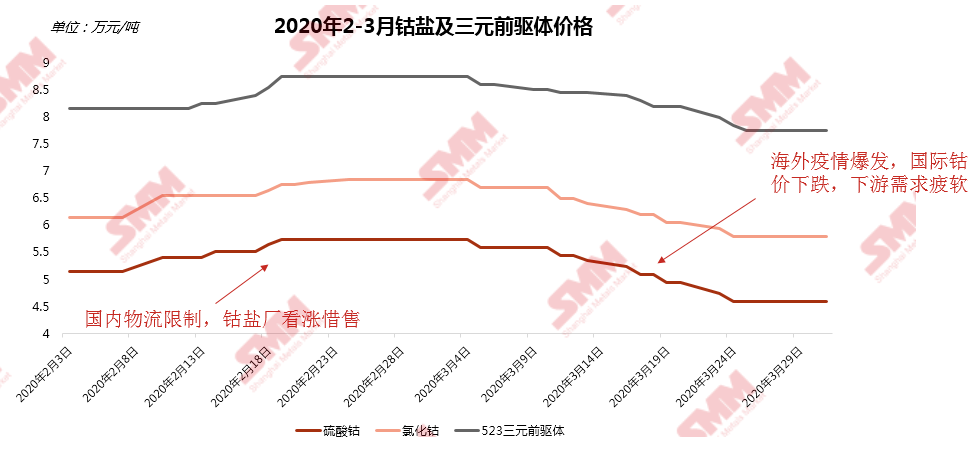 3月初終端需求未起,鈷原料供給充足,鈷鹽價格開始回調。3月中下旬,全球疫情影響,國際鈷、鎳金屬價格下降,下游動力市場需求未有大幅增加,數碼市場需求減弱,下游電池廠壓價嚴重,帶動鈷鹽及前驅體價格進一步下滑。