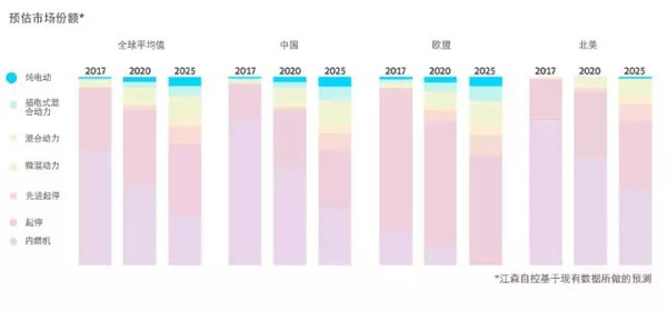 根據(jù)江森自控基于車企產(chǎn)能的預(yù)測(cè),無(wú)論是中國(guó)、北美還是歐盟,到2020年,甚至2025年,純電動(dòng)以及插電式混合動(dòng)力汽車的份額都十分有限。