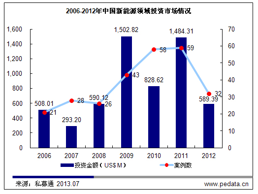 從投資數量情況看,2006-2012年,中國新能源領域已披露的投資案例累積272起。自2009年起,新能源領域進入快速發展期,當年投資數量超過2006年全年投資數量的一倍。2010和2011年的投資數量更是維持在近幾年投資熱點的頂峰,達到在2007年新能源領域出現小幅增長的基礎上再次翻番的熱鬧景象。但到了2012年,由于國家經濟環境較為低迷,新能源領域的投資熱度也出現急速下滑現象,一舉回落至2007年水平,降幅接近50%。