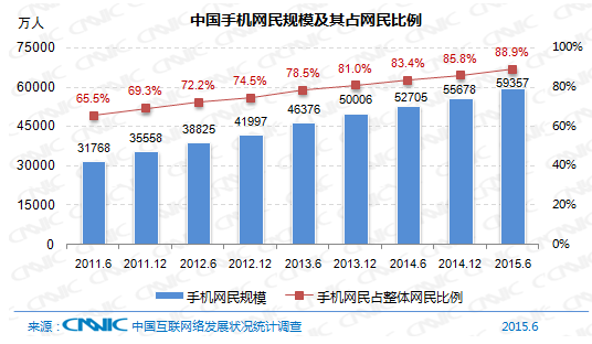 截至2015年6月,我國(guó)手機(jī)網(wǎng)民規(guī)模達(dá)5.94億,較2014年12月增加3679萬(wàn)人。網(wǎng)民中使用手機(jī)上網(wǎng)的人群占比由2014年12月的85.8%提升至88.9%。
