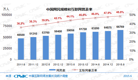 截至2015年6月,我國(guó)網(wǎng)民規(guī)模達(dá)6.68億,半年共計(jì)新增網(wǎng)民1894萬(wàn)人。互聯(lián)網(wǎng)普及率為48.8%,較2014年底提升了0.9個(gè)百分點(diǎn),整體網(wǎng)民規(guī)模增速繼續(xù)放緩。