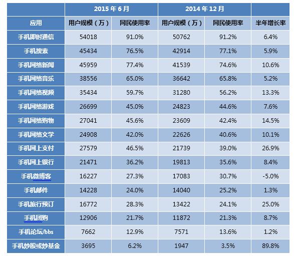 2014.12-2015.6中國手機網(wǎng)民對各類手機應用的使用率
