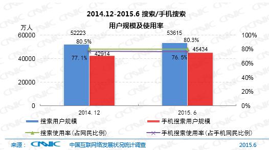 截至2015年6月,我國搜索引擎用戶規(guī)模達5.36億,使用率為80.3%,用戶規(guī)模較2014年底增長1392萬人,增長率為2.7%;手機搜索用戶數(shù)達4.54億,使用率達76.5%,用戶規(guī)模較2014年底增長2520萬人,增長率為5.9%。