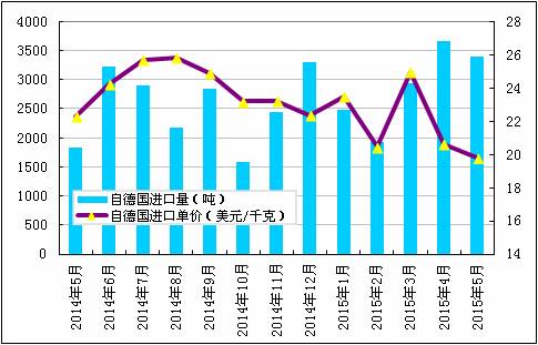 2015年5月份從德國進口多晶硅量減少至3402噸,環(huán)比降幅為7.2%;5月份進口單價下滑至19.78美元/千克,環(huán)比跌幅為4.1%。