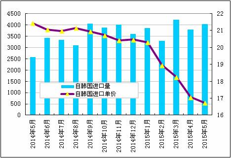 2015年5月份從韓國進口多晶硅量增加至4027噸,環(huán)比增幅為6.1%;5月份進口單價小幅下滑至16.74美元/千克,環(huán)比降幅為1.9%。