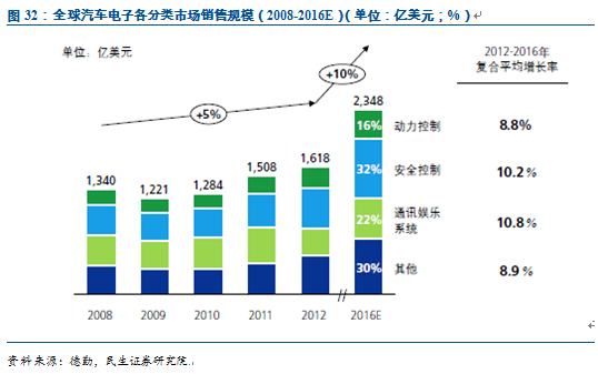 通訊娛樂系統(tǒng)與安全控制系統(tǒng)開始步入增長期。根據(jù)德勤報告的數(shù)據(jù)顯示,預(yù)計2012-2016E通訊娛樂系統(tǒng)年復(fù)合增長率將達10.8%,為各細分行業(yè)中年復(fù)合增長率最快,安全控制系統(tǒng)年復(fù)合增長率將為10.2%,位居第二。