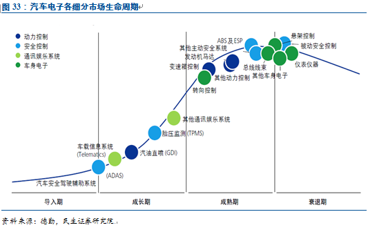 安全駕駛輔助系統(tǒng)(ADAS)與車載信息系統(tǒng)處于導(dǎo)入與成長期,成長空間巨大。從汽車電子各細分行業(yè)生命周期來看,屬于安全控制系統(tǒng)的汽車安全駕駛輔助系統(tǒng)處于導(dǎo)入與成長期,原來僅在豪華車上使用,現(xiàn)在逐步進入中高端市場;處于成長期的還有屬于安全控制系統(tǒng)的胎壓監(jiān)測(Tire Pressure Monitor System,TPMS),屬于通訊娛樂系統(tǒng)的車載信息系統(tǒng)、其他通訊娛樂系統(tǒng),以及屬于動力控制系統(tǒng)的汽油直噴。