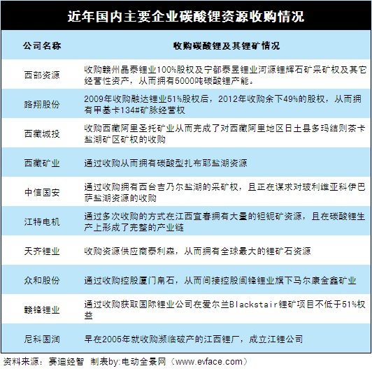 “并購”已成為大多數(shù)企業(yè)進(jìn)入碳酸鋰資源的最優(yōu)途徑。從西藏城投、中信國安、西藏礦業(yè)等企業(yè)布局中國鹽湖資源到西部資源、路翔股份、眾和股份控制中國鋰礦石資源,通過收購從而直接或者間接控制資源成為企業(yè)慣用的招數(shù)。