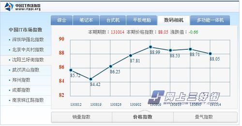 與銷(xiāo)量指數(shù)的持續(xù)走低到平穩(wěn)完全相反,價(jià)格指數(shù)持續(xù)走高到最終平穩(wěn)。期初130819期為最低點(diǎn)84.42,這個(gè)時(shí)候相機(jī)廠商都在蓄力發(fā)布新品,各大商家 都紛紛開(kāi)始清理庫(kù)存,對(duì)庫(kù)存商品進(jìn)行低價(jià)促銷(xiāo)的處理。自130819期往后,新品逐漸發(fā)布,價(jià)格趨勢(shì)持續(xù)上漲從84.42點(diǎn)到86.25點(diǎn)到87.81點(diǎn) 到最高130909期的88.99點(diǎn),這個(gè)區(qū)間正好處于相機(jī)產(chǎn)品新舊交替,清理的舊貨逐漸被新貨所取代,價(jià)格也就自然高漲。從130909期開(kāi)始到目前的 131014期相機(jī)產(chǎn)品的新舊交替逐漸結(jié)束,新品占據(jù)主流,價(jià)格指數(shù)自此趨于穩(wěn)定。