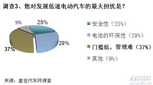 調查3的話題就圍繞對低速電動汽車的擔憂展開,對此業內的觀點比較分散,有37%的參與者選擇了"門檻低,管理難"。上文提到有摩托車的制造水平就可以生產低速電動車,可見,對汽車從業企業而言,進入低速電動汽車領域幾乎是零門檻的。