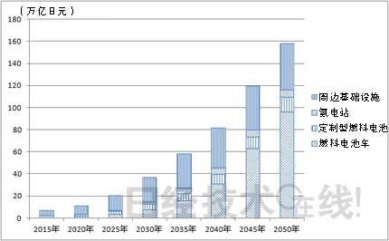 世界各地都掀起了利用氫能源的浪潮。日經BP清潔技術研究所2013年10月24日發行的報告《世界氫基礎設施項目總覽》顯示,全球氫基礎設施的市場規模到2050年將達到約160萬億日元(圖1)。