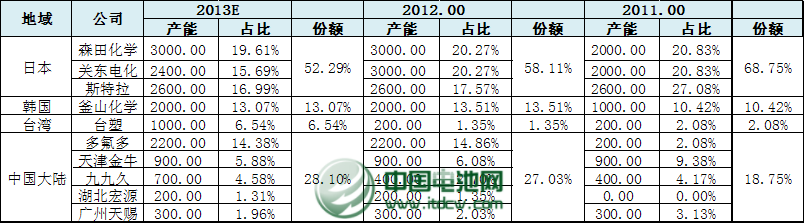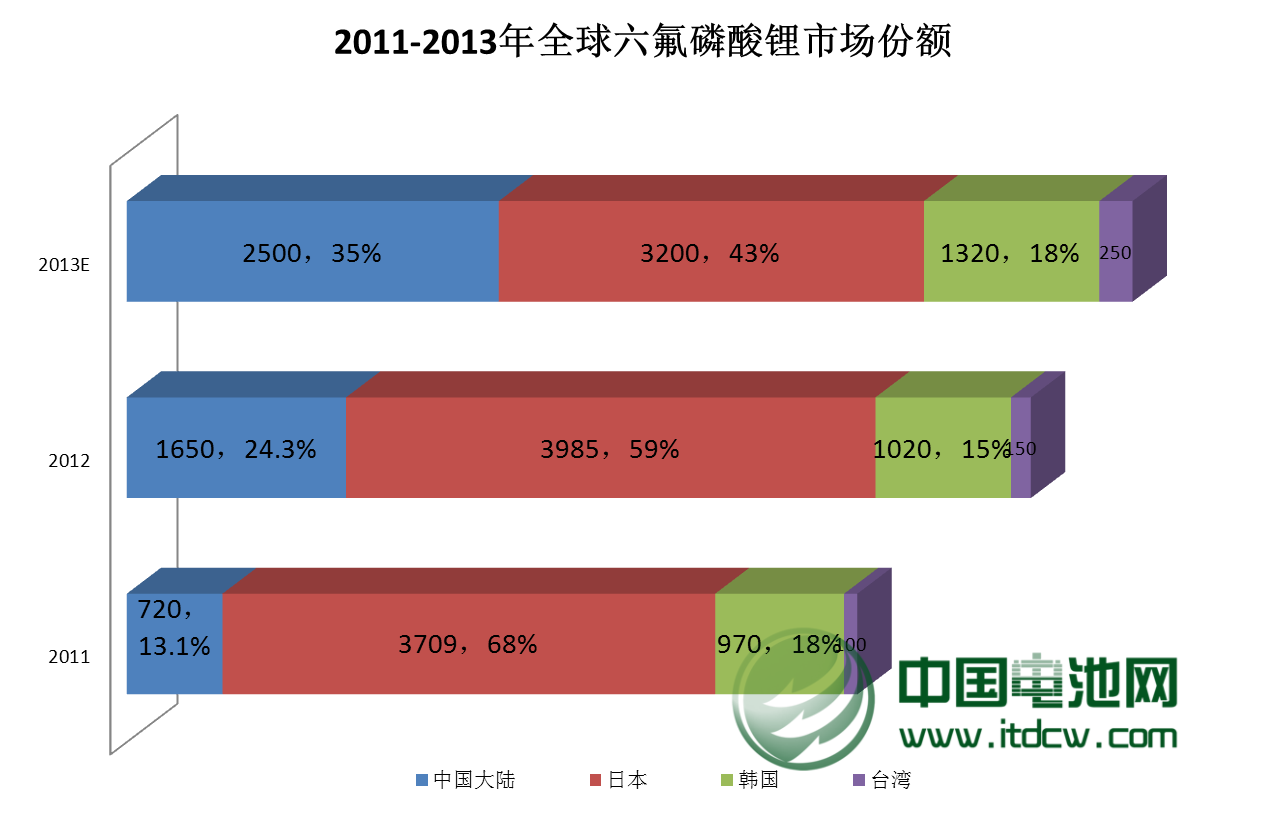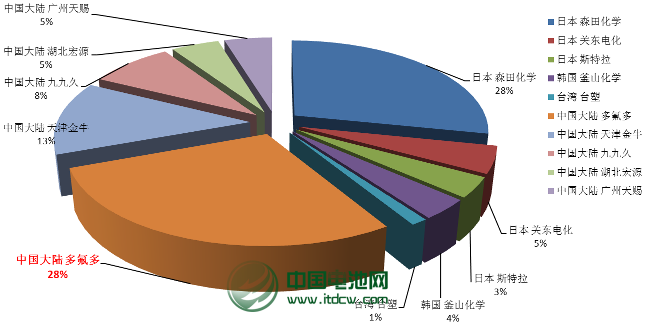 中國電池雜志-中國電池網(wǎng)12月10日訊(肖何 北京報(bào)道)近日,多氟多化工股份有限公司(以下稱“多氟多”)副總經(jīng)理李云峰對中國電池網(wǎng)表示,六氟磷酸鋰行業(yè)正面臨著激烈的市場競爭和挑戰(zhàn),他表示,日韓及中國和中國臺灣占據(jù)了全球六氟磷酸鋰市場的絕大部分份額,其中日本的森田化學(xué)、關(guān)東電化、斯特拉等三家企業(yè)從2011年68.75%下降到今年10月的52.29%,而韓國的釜山化學(xué)相比有所提升,目前占全球份額的13.07%。而中國的多氟多、天津金牛、九九久、湖北宏源、廣州天賜等五家企業(yè)占據(jù)28.10%的市場份額,六氟磷酸鋰的國產(chǎn)化仍有提升空間。