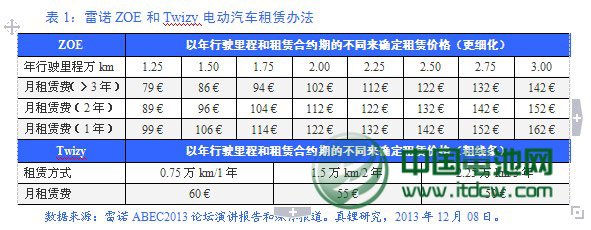 中國電池雜志-中國電池網(wǎng)戰(zhàn)略合作伙伴——真鋰研究曾于2012年09月《鋰電信息動態(tài)與分析》(產(chǎn)業(yè)研究月度報告)中介紹了雷諾微型電動汽車(可以歸納為低速電動汽車這一類)Twizy(配備6.1kWh電池組,由LG化學(xué)提供)的租賃辦法,本次演講雷諾介紹了其2012年11月推向市場的電動汽車ZOE(長4,084mm,軸距2,588mm,是一款兩廂的緊湊型純電動汽車,配備22kWh的鋰離子電池組,由LG化學(xué)提供;該車的公開售價為1.37萬歐元(含7,000歐元的政府采購補(bǔ)貼,但不包括電池組在內(nèi)))的租賃辦法,我們將二者對比看一下,見表1: