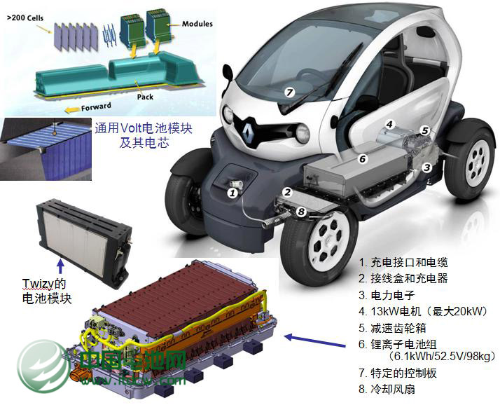 Twizy的電池模塊與Volt的對比(Twizy尺寸為長2,335×寬1,228×高1,451mm,軸距1,686mm,整備質(zhì)量467kg;電機(jī)功率13kW,最大20kW;最大扭矩57N·m;最高時速80km/h;一次充電最大續(xù)航里程:100km(廠家提供數(shù)據(jù)),83km(第三方提供數(shù)據(jù)))