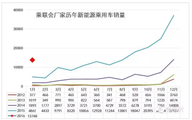 1月的新能源車銷量13748臺,同比15年1月的4861臺增長1.8倍,增速仍保持較高水平。歷年的新能源車都是前低后高的加速拉升走勢,15年從8月以來的新能源車銷量進(jìn)入拉升軌跡,15年年末幾個月都是月度環(huán)比暴增,12月更是環(huán)比暴增萬臺左右,市場熱度快速升溫。16年1月的降溫是符合正常的走勢特征的。