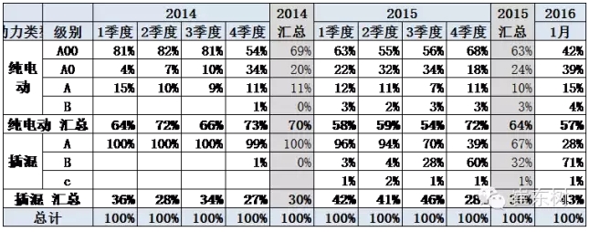 15年的純電動車中的A00級車占比達(dá)63%,且A0級成為純電動乘用車的絕對主力,這兩類組合的經(jīng)濟(jì)型電動車成為主力。但16年1月的A級電動車爆發(fā)增長到15%,這是暫時的年度波動數(shù)量的特殊狀態(tài),同時也是A00級電動車的暫時調(diào)整的影響。