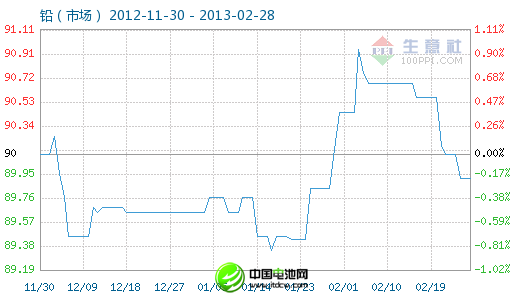 2月27日鉛(市場(chǎng))商品指數(shù)為89.92,與昨日持平,較周期內(nèi)最高點(diǎn)100.00點(diǎn)(2011-09-01)下降了10.08%,較2011年09月29日最低點(diǎn)86.80點(diǎn)上漲了3.59%。(注:周期指2011-09-01至今)