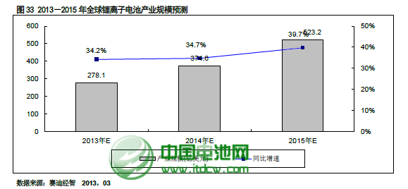 預(yù)計(jì)到2013 年全球鋰離子電池產(chǎn)業(yè)規(guī)模將達(dá)到278.1 億美元,2015 年,新能源汽車的產(chǎn)業(yè)化應(yīng)用將帶動(dòng)全球鋰離子電池的產(chǎn)業(yè)規(guī)模達(dá)到523.2 億美元。