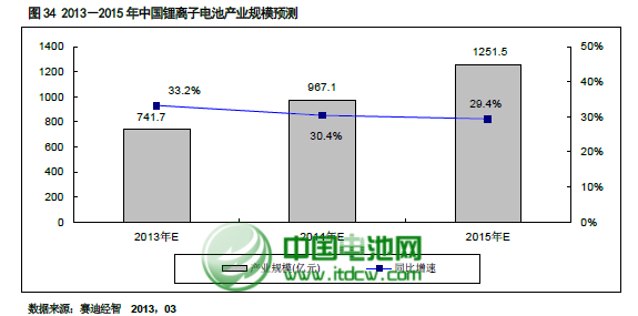 就中國(guó)市場(chǎng)而言,得益于動(dòng)力鋰離子電池的快速發(fā)展,2013 年鋰離子電池整體市場(chǎng)規(guī)模將達(dá)到741.7 億元,同比增長(zhǎng)33.2%,并且未來三年市場(chǎng)規(guī)模增速均會(huì)保持在30%以上,到2015 年整個(gè)中國(guó)鋰離子電池的市場(chǎng)規(guī)模將突破1000 億元,達(dá)到1251.5 億元。