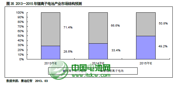 從鋰離子電池市場(chǎng)結(jié)構(gòu)來看,我們認(rèn)為鋰離子市場(chǎng)規(guī)模未來三年內(nèi)增長(zhǎng)的動(dòng)力來自于以新能源汽車電池為代表的動(dòng)力電池。到2015 年鋰離子動(dòng)力電池市場(chǎng)規(guī)模占比將達(dá)到49.2%。