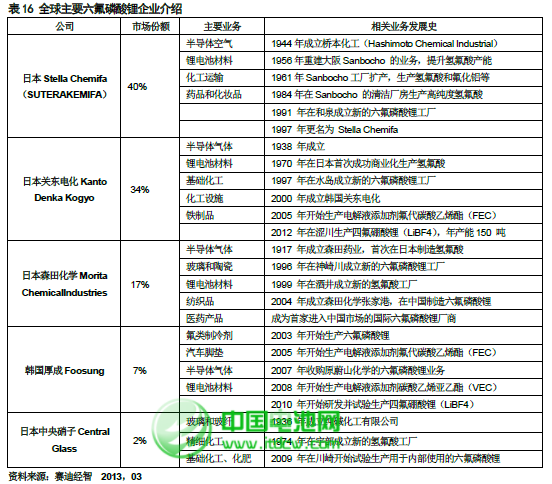 中國(guó)所需的六氟磷酸鋰電解質(zhì)基本都從日本采購,關(guān)鍵原材料的受制于人嚴(yán)重阻礙了中國(guó)整個(gè)電解液產(chǎn)業(yè)的發(fā)展。近期,國(guó)內(nèi)企業(yè)已經(jīng)充分認(rèn)識(shí)到這點(diǎn),紛紛加大對(duì)六氟磷酸鋰的研發(fā)和投資力度。目前能夠產(chǎn)業(yè)化生產(chǎn)六氟磷酸鋰的企業(yè)主要包括多氟多、天津金牛、廣州天賜、九九久等企業(yè)。據(jù)中國(guó)電池網(wǎng)-中國(guó)電池雜志了解,目前多氟多的六氟磷酸鋰已經(jīng)出口到韓國(guó)等國(guó)家。