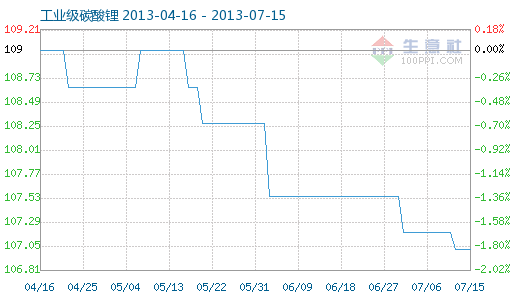 7月15日工業級碳酸鋰商品指數為107.01,與昨日持平,較周期內最高點112.10點(2012-11-04)下降了4.54%,較2012年01月05日最低點98.94點上漲了8.16%。(注:周期指2011-09-01至今) 工業級碳酸鋰商品指數