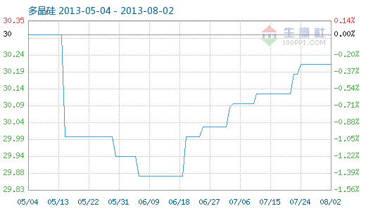 8月2日多晶硅商品指數為30.22,與昨日持平,較周期內最高點100.00點(2011-09-08)下降了69.78%,較2012年12月24日最低點29.12點上漲了3.78%。(注:周期指2011-09-01至今)
