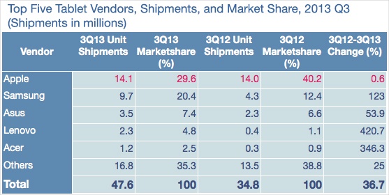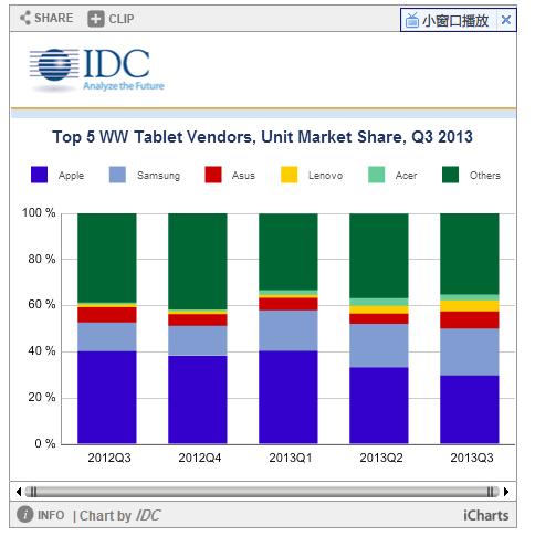 根據IDC公司最新公布的數據顯示蘋果在今年第三季度共計發售1410萬臺iPad,相比較第二季度環比下降50萬臺。而蘋果的最大競爭對手三星的Android設備在本季度的出貨量為970萬臺,位居第二。